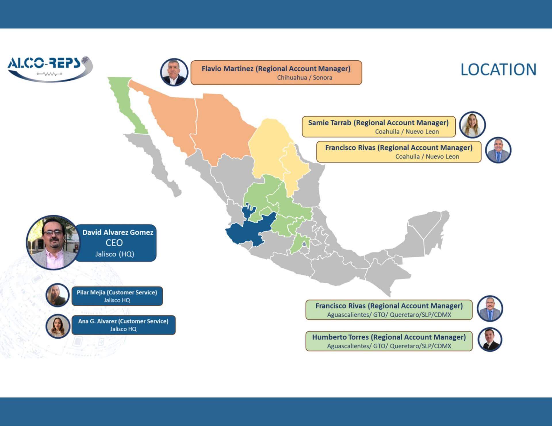 Contamos con el mejor equipo de representantes. Se encuentra en Jalisco, Chihuahua, Nuevo León y Querétaro de tal manera que cubrimos puntos estratégicos para así poder llegar a toda la república.